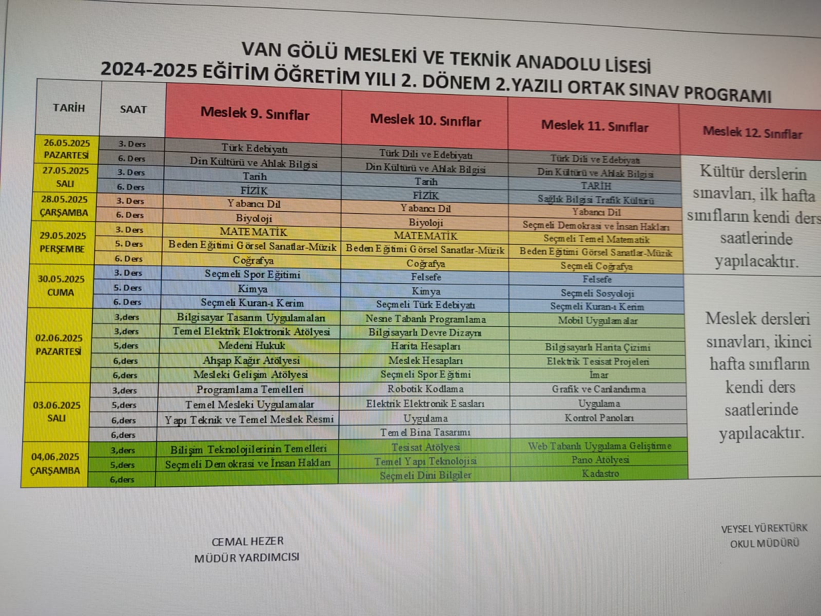 OKULUMUZ 2024-2025 EĞİTİM ÖĞRETİM YILI 2. DÖNEM 2.YAZILI ORTAK SINAV PROGRAMI